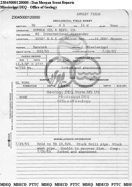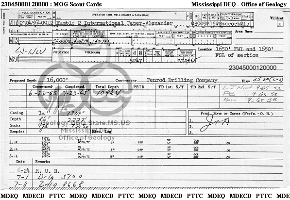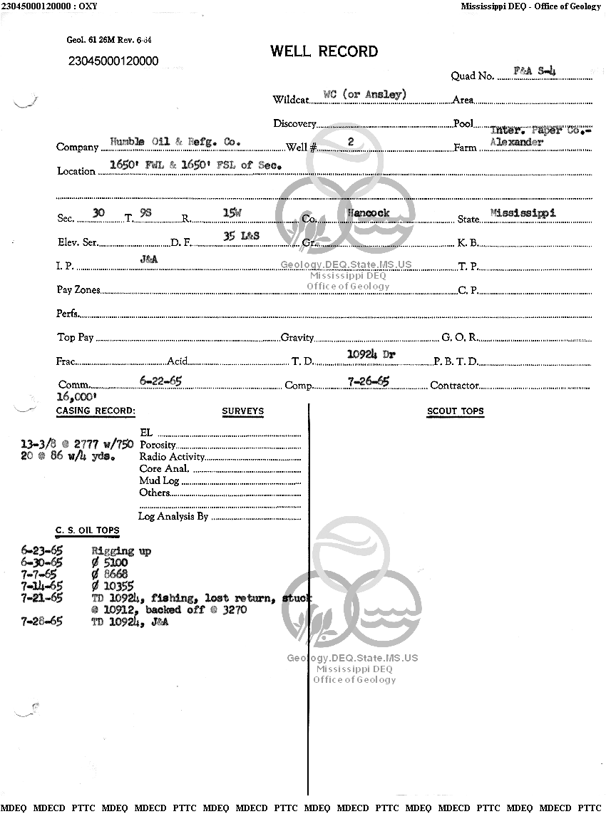 | 1 | 23045000120000 | HUMBLE OIL & REFINING CO. | INTERNATIONAL PAPER CO.- ALEXANDER | 2 | Dry Hole |