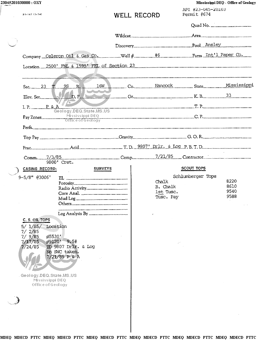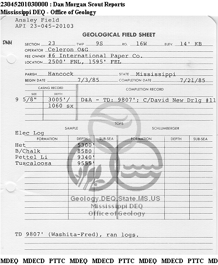 | 1 | 23045201030000 | CELERON OIL AND GAS CO. | INTL PAPER | 6 | Dry Hole |