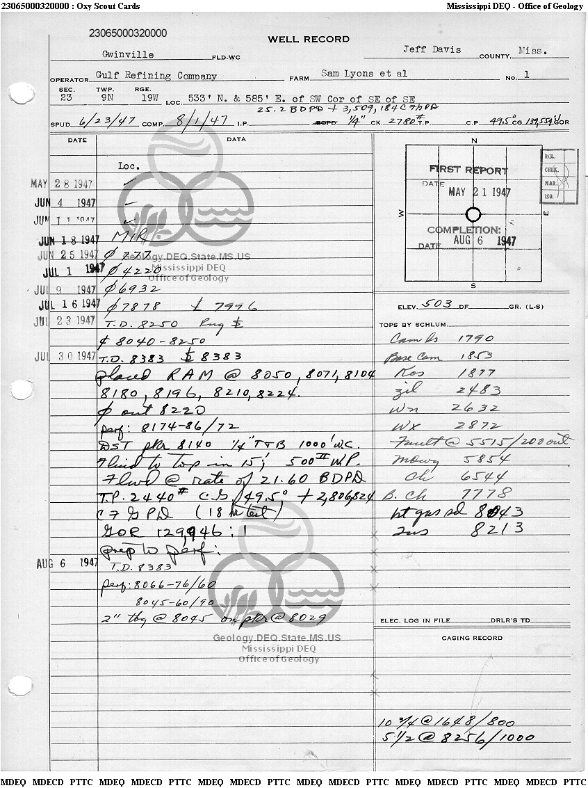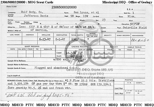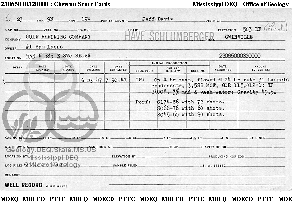 | 1 | 23065000320000 | GULF OIL CORP. | SAM LYONS | 1 | Production |