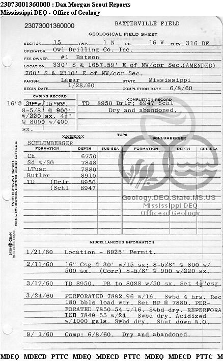 | 1 | 23073001360000 | OWL DRILLING CO., INC. | Batson | 1 | Dry Hole |