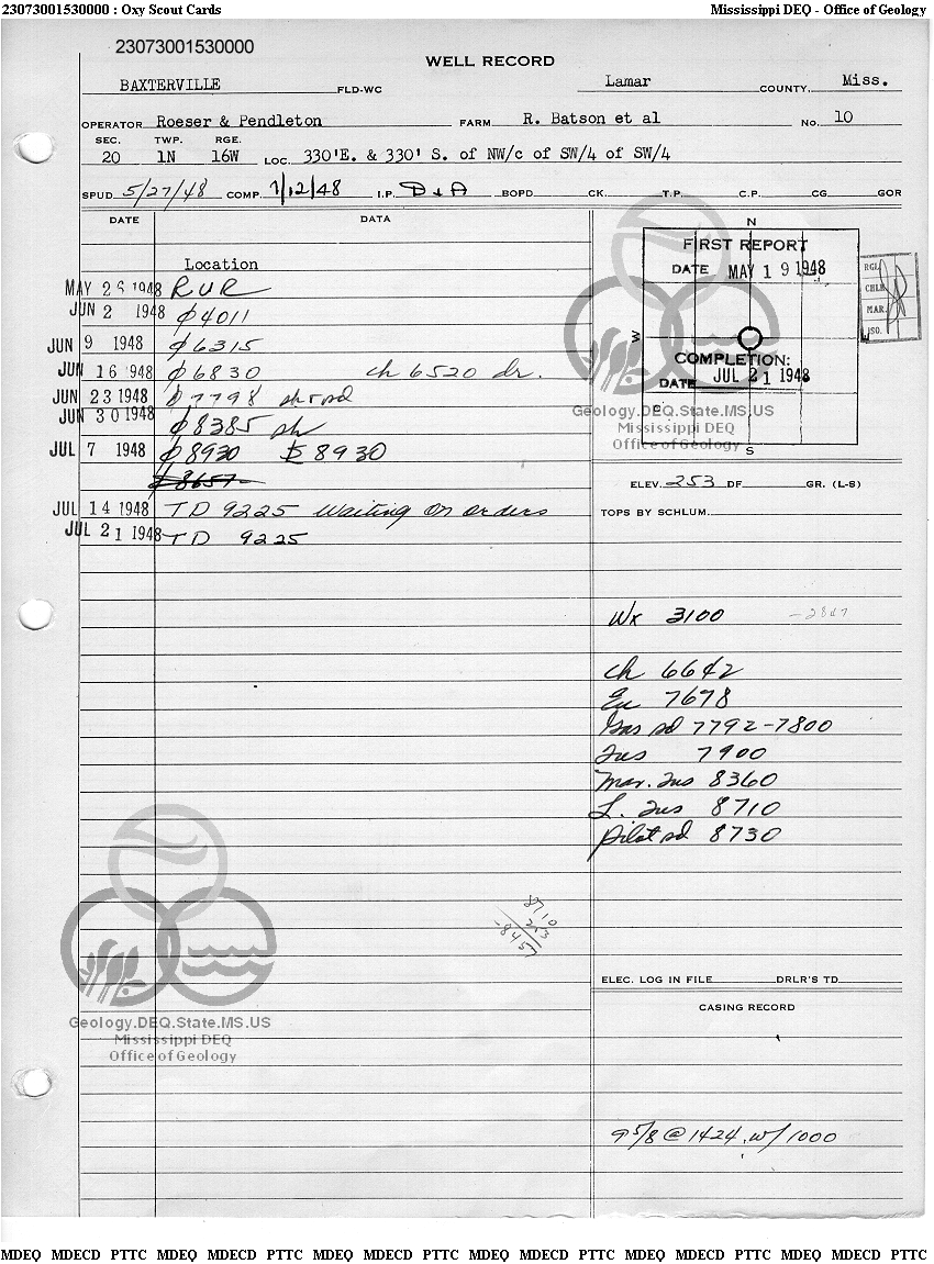 | 1 | 23073001530000 | ROESER & PENDLETON, INC. | R BATSON ETAL | 10 | Dry Hole |