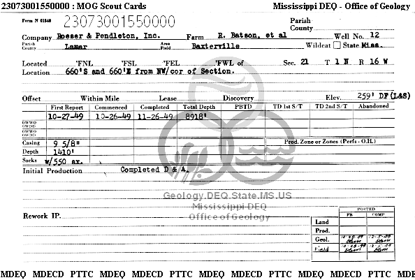 | 1 | 23073001550000 | ROESER & PENDLETON, INC. | R BATSON ETAL | 12 | Dry Hole |