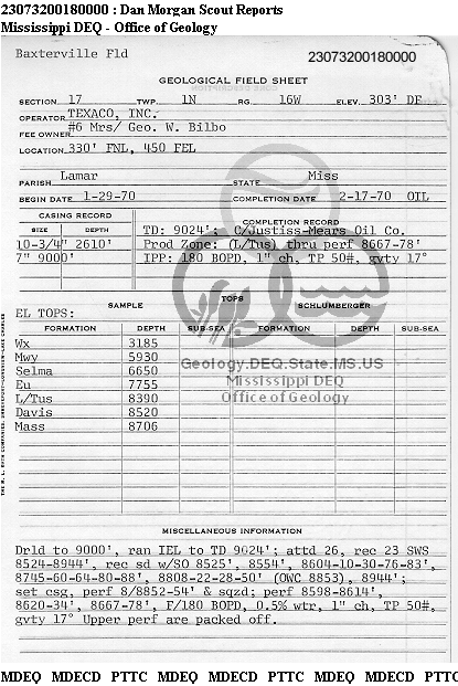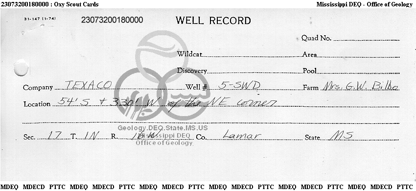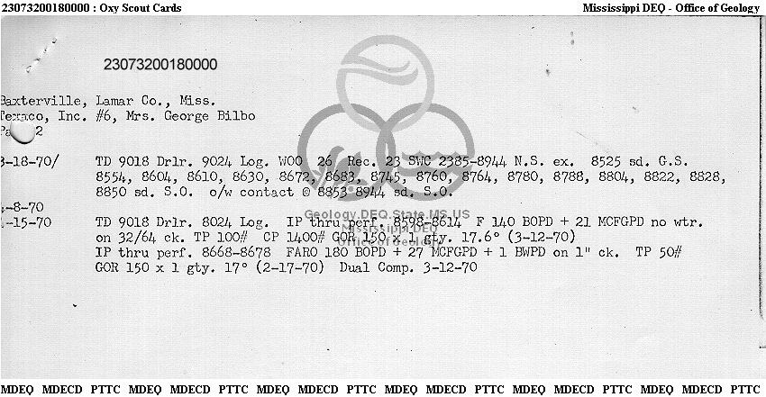| 1 | 23073200180000 | TEXAS PETROLEUM INVESTMENT CO | MRS G W BILBO "B" | 6 | Oil Production |