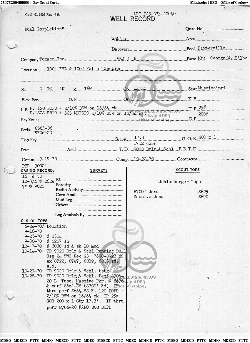 | 1 | 23073200400000 | TEXAS PETROLEUM INVESTMENT CO | MRS G W BILBO "B" | 8 | Oil Production |
