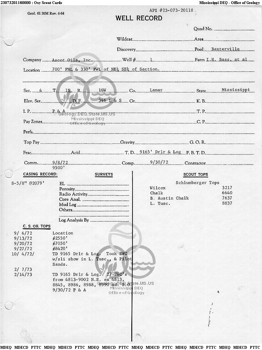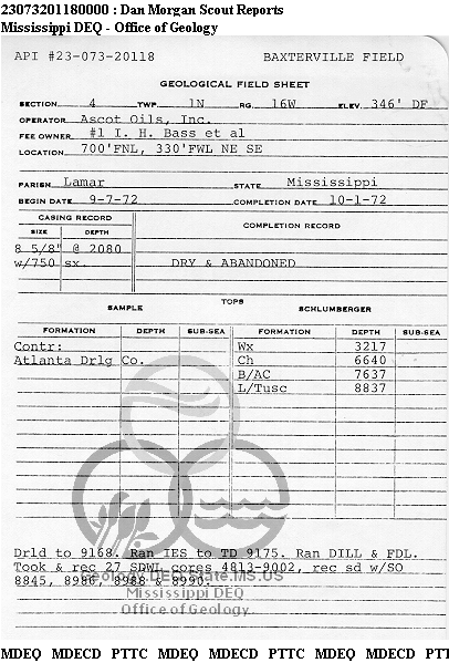 | 1 | 23073201180000 | ASCOT OILS, INC. | I H BASS ETAL | 1 | Dry Hole |