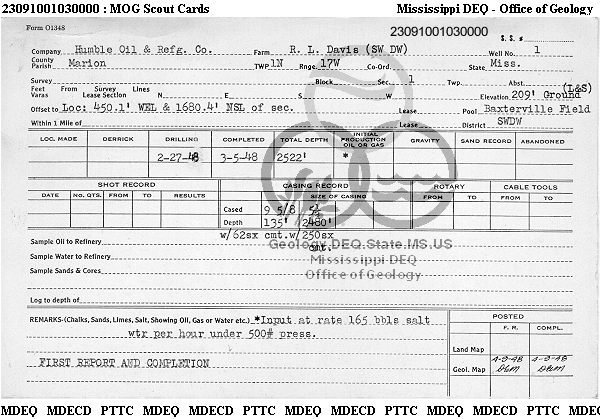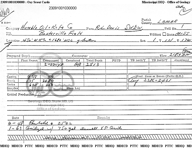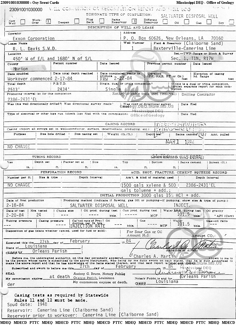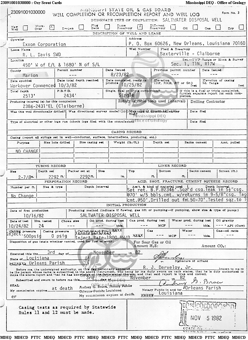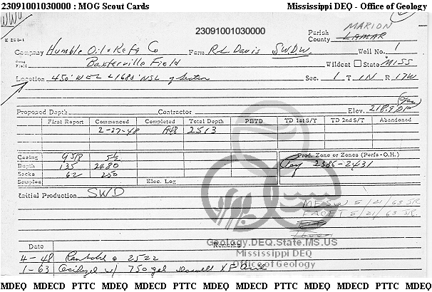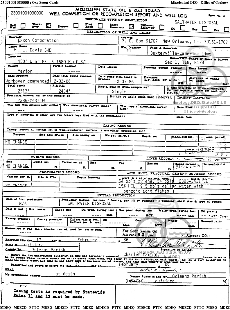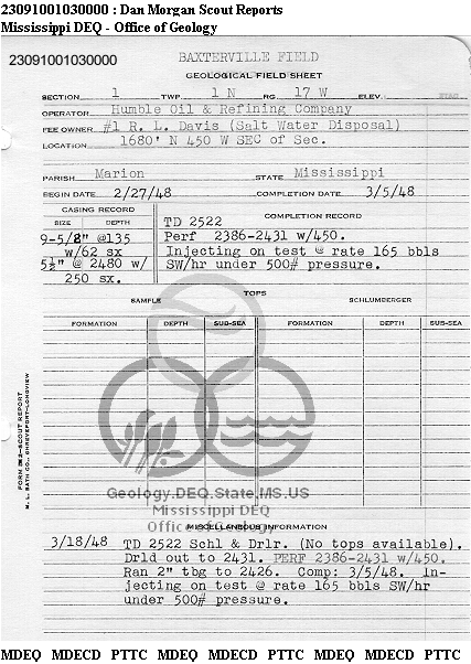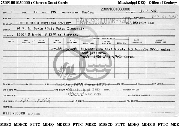 | 1 | 23091001030000 | TEXAS PETROLEUM INVESTMENT CO | R. L. DAVIS SWDW | 1 | Disposal |
