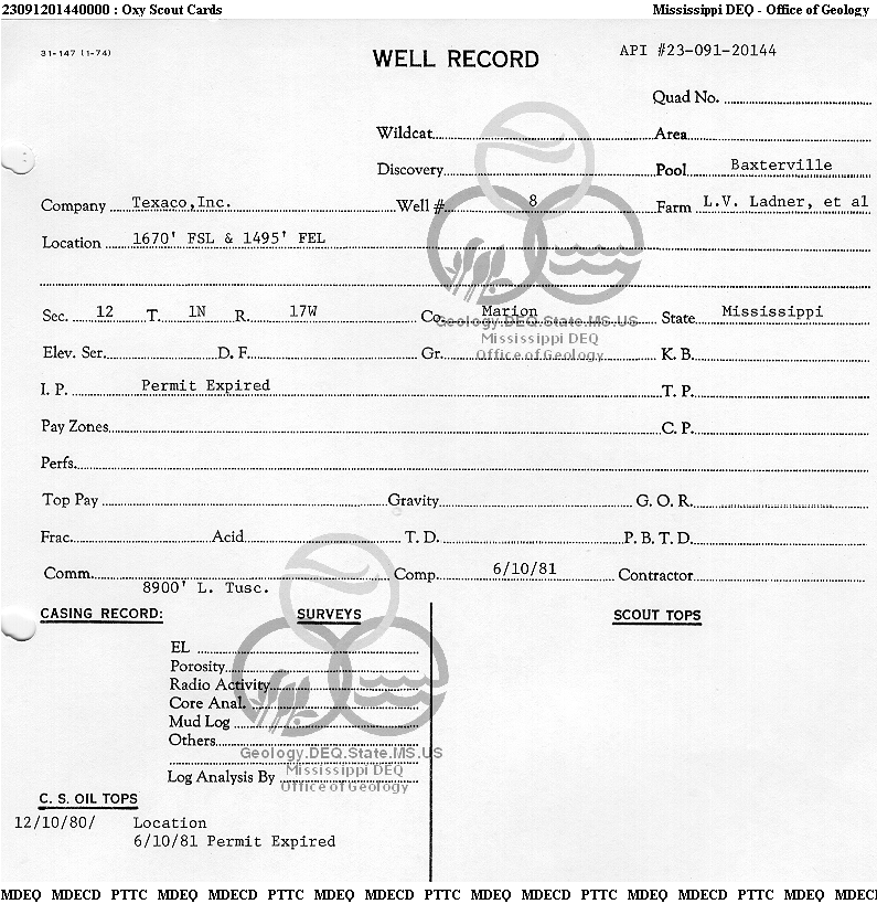 | 1 | 23091201440000 | TEXACO INC. | L. V. LADNER ET AL | 8 | Expired Location |