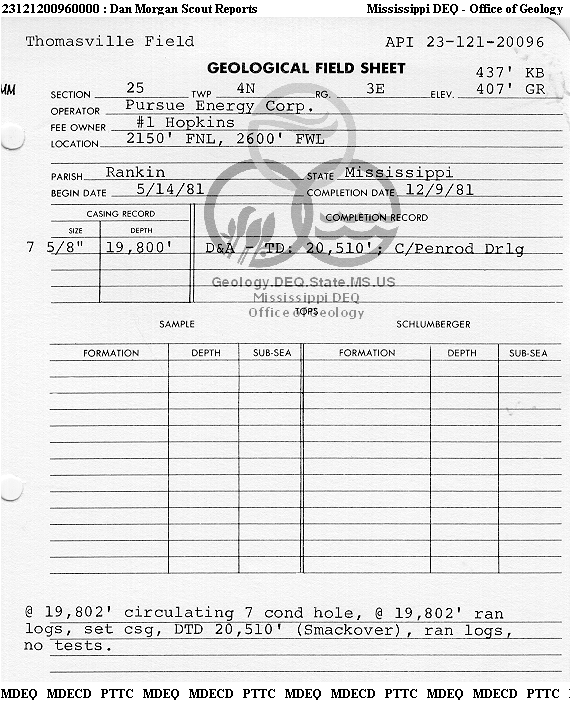 | 1 | 23121200960000 | PURSUE ENERGY CORP | Hopkins | 1 | Dry Hole |