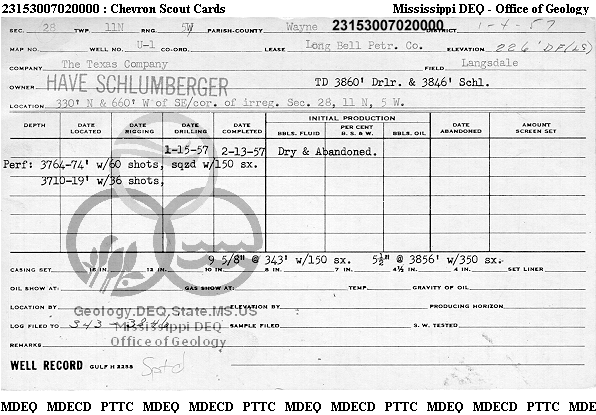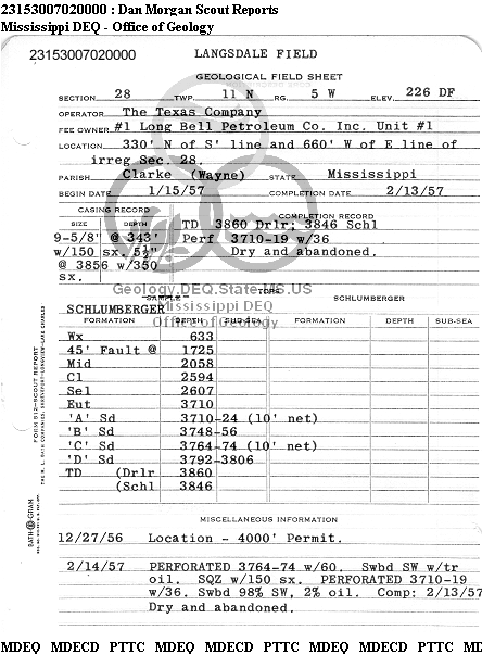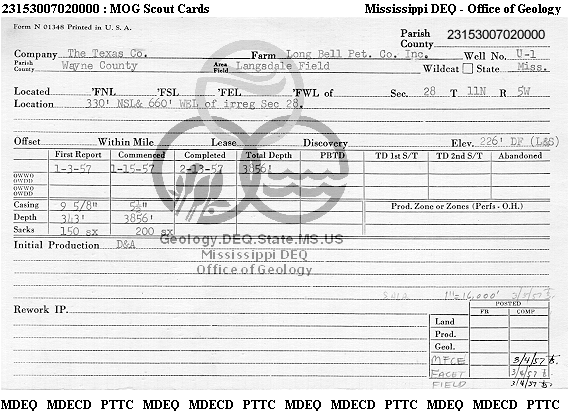| 1 | 23153007020000 | TEXAS OIL & GAS CORP. | LONG BELL PET CO U | 1 | Dry Hole |