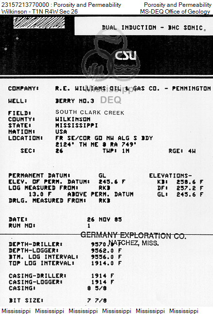 | 23157213770000 | Porosity and Perm Log | Porosity Log - Sonic or Induction | view | 1 |