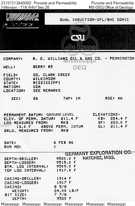 | 23157213840000 | Porosity and Perm Log | Porosity Log - Sonic or Induction | view | 1 |